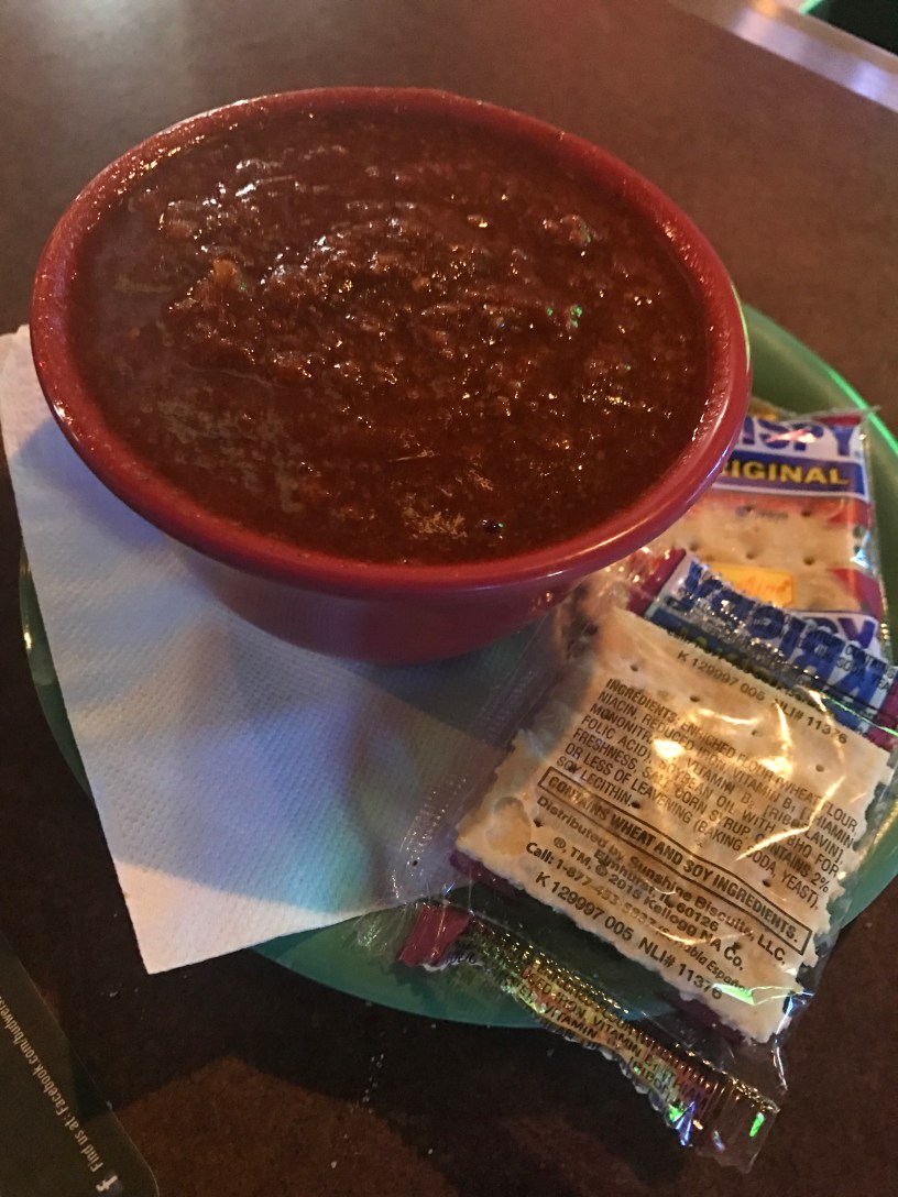 Our chili came out almost immediately after ordering it. Now some may think it’s great to get your food so quick. However when it comes out so fast and it’s piping hot this late at night, it’s usually a sign it may have been on high in the crockpot for the last 9 hours. It was so hot when it came out that you couldn’t eat it. (Of course I did anyway but I get excited when a new bowl of chili is in front of me.) Due to the heat I couldn’t get a good feel for the taste but I could tell it wasn’t anything special. The meat was so fine it was like eating the crumbs out of the bottom of bag of chips. I decided to let it cool off thinking the flavor might come out once it was at a safe temperature. But honestly it only got worse. It was just a plain Jane bowl of chili after the heat lifted. It was very boring with little flavor and gritty ingredients.